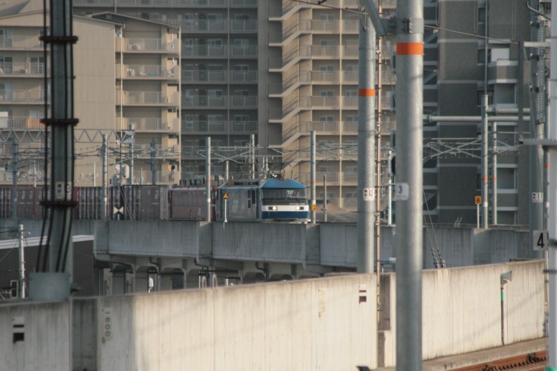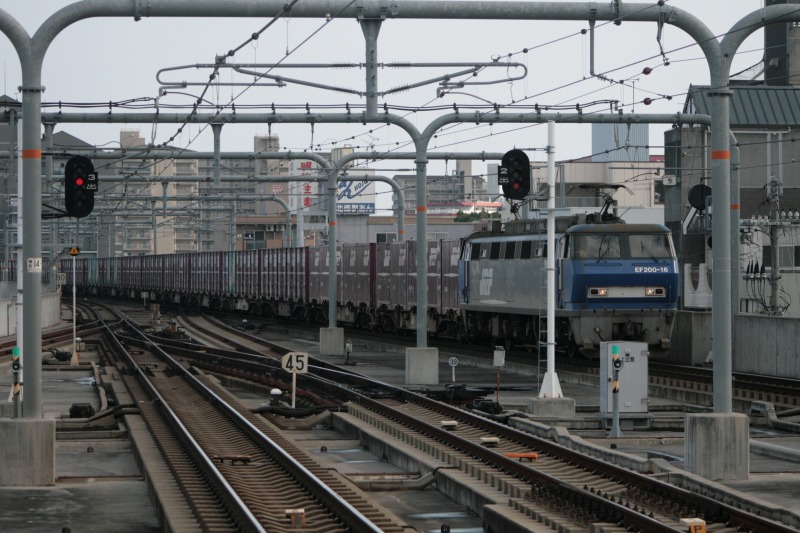 同業者が多かったので対向ホームから望遠で。EF200-16牽引。