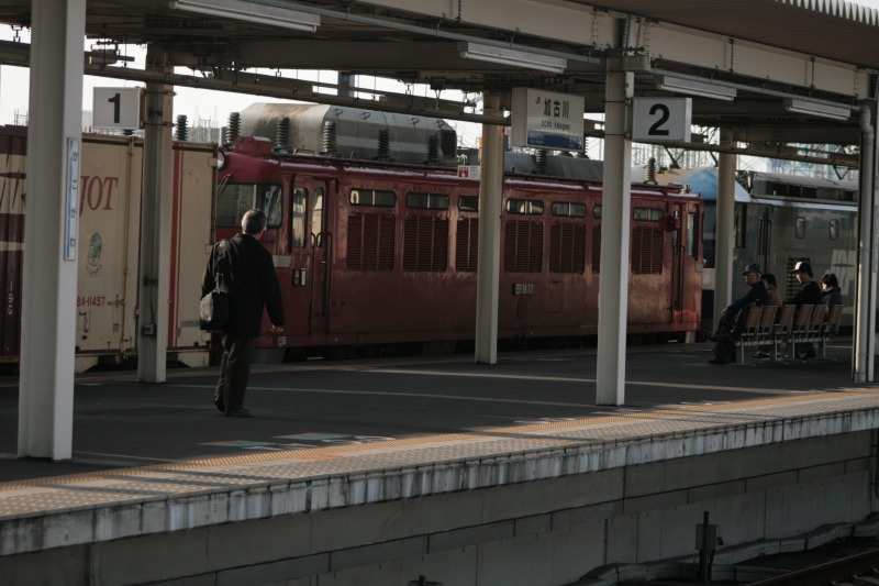 機関車をアップで。入れ替えか何かに使われてたのかテールライトが点いてますね。