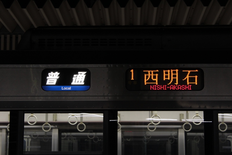 普通/西明石行きが到着。早朝深夜のみのレア行き先です。