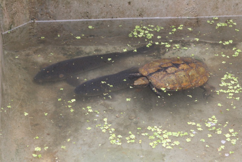 コイとフナとカメ。フナは釣りで人気の高い「ヘラブナ」(ゲンゴロウブナ)です。(ちなみに釣ってません)