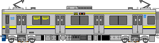 ここでは、架空鉄道「長堀高速鉄道」の最新形式・6600系を紹介します。長堀高速鉄道6600系電車は、3+7の10連を基本とし、最高速度140km/hを誇ります。編成は長堀側からクモハ6600+モハ6600+クハ6600+クハ6800(6ドア車)+モハ6600+モハ6600+サハ6600+モハ6700(可変座席装備)+モハ6700(可変座席装備)+クハ6700(可変座席装備)です。今日はこの中から長堀側先頭車・クモハ6600を紹介します。クモハ6600は、車体後部に車椅子スペースを持つ付属編成の長堀側先頭車です。この形式は1M方式で、走行に必要な機器類を全て搭載しています。また、この車両はパンタグラフ集電と第三軌条の2つの給電方式に対応しており(地下鉄乗り入れ運用が存在するため)自重は45・6tになっています。長堀高速鉄道では全線で見られる車両であり朝夕ラッシュ時の最速達運用・高快速にも入ります。次に紹介予定の車両は、モハ6600(M車)の予定です。