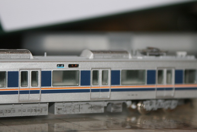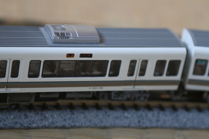 トミックスの321系に321系行き先パーツを無理やり押し込んだら何とか入りました。行き先部分には221系のシールを追加して京都行きにしました。
