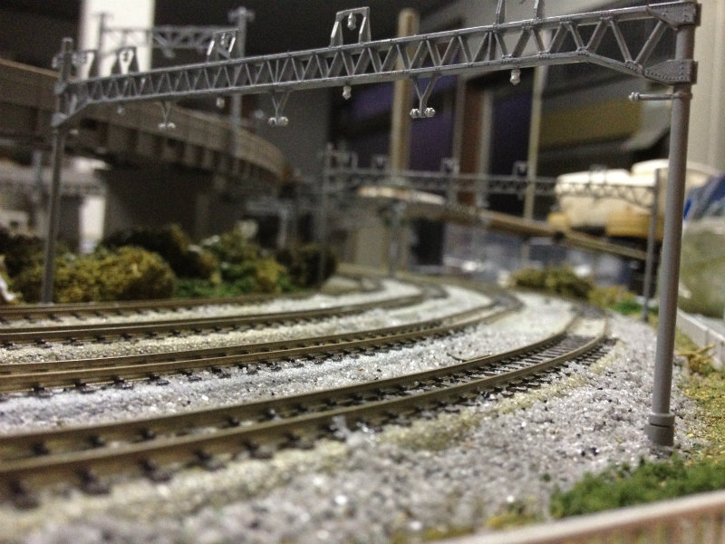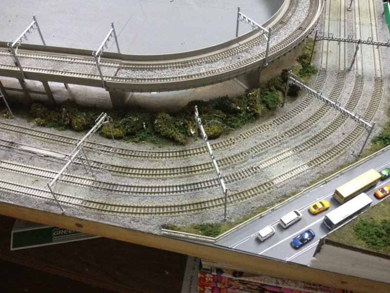 レイアウト一番の見せ場・駅西側カーブもちょっと緑の数を増やしてみました。