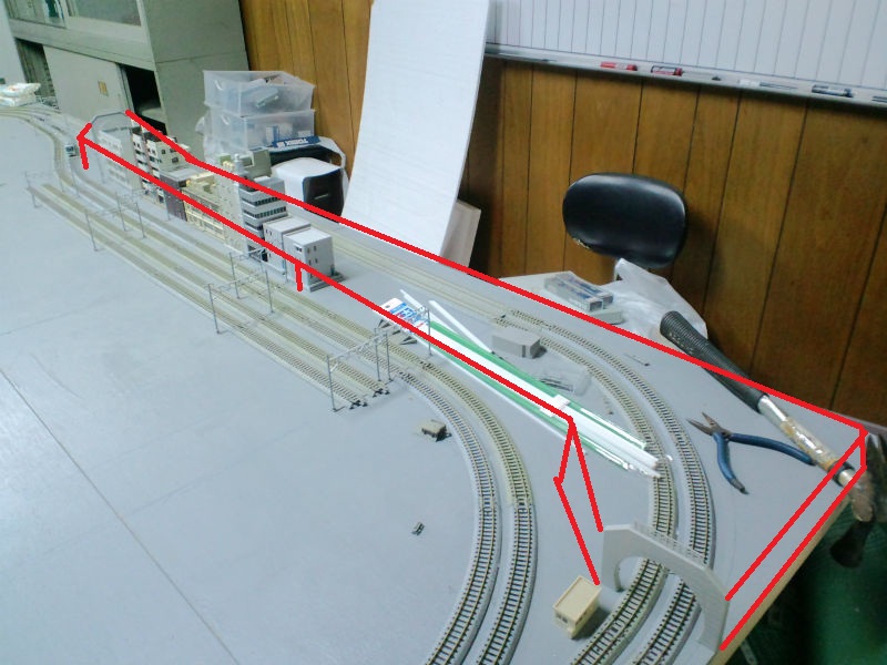 初期状態ではレイアウトの一角だけが台地(高台)になる予定でしたが風景が不自然になるのでレイアウトのバックを台地で覆ってしまうことにしました。(赤線部分)