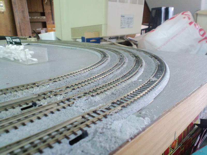 今回は架線柱の関係もあって線路の間のみバラストを撒いておきました。
