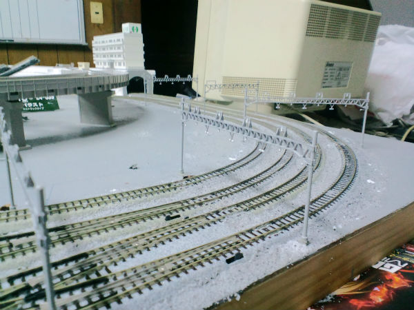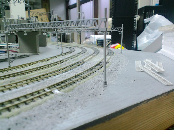 撒いていなかった所にもバラストを撒いてKATOの複々線架線柱を立てました。
