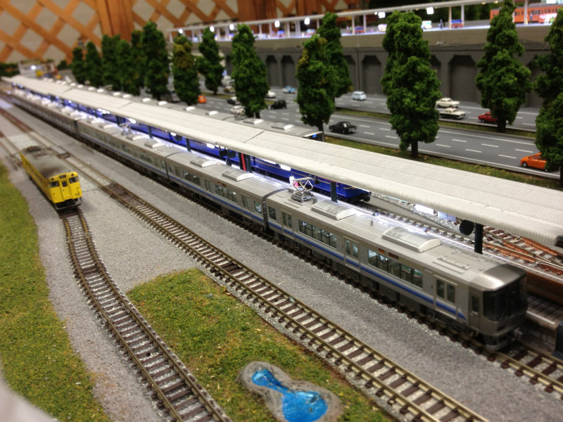 223系の気合の入ったウェザリングも必見。221系登場時仕様の「新快速」8連もいたのでA10完成の暁には是非とも並べてみたいですね~。
