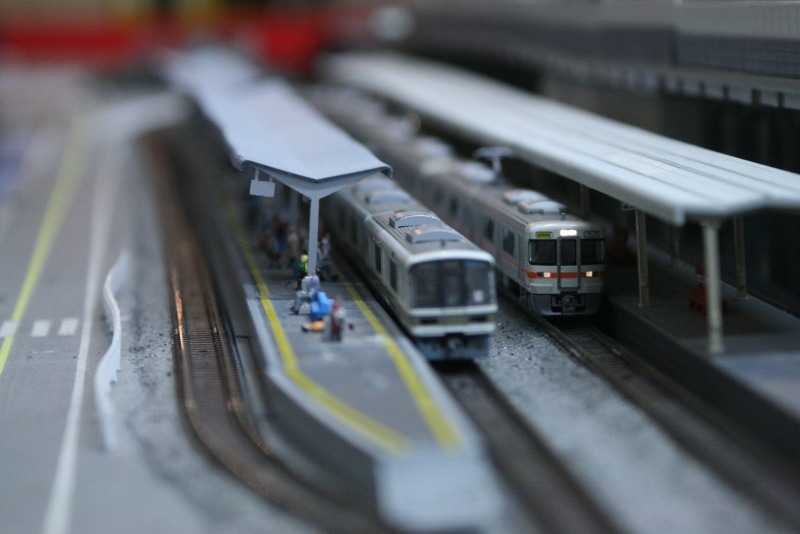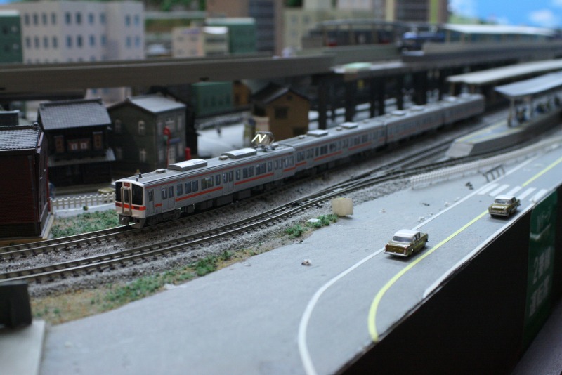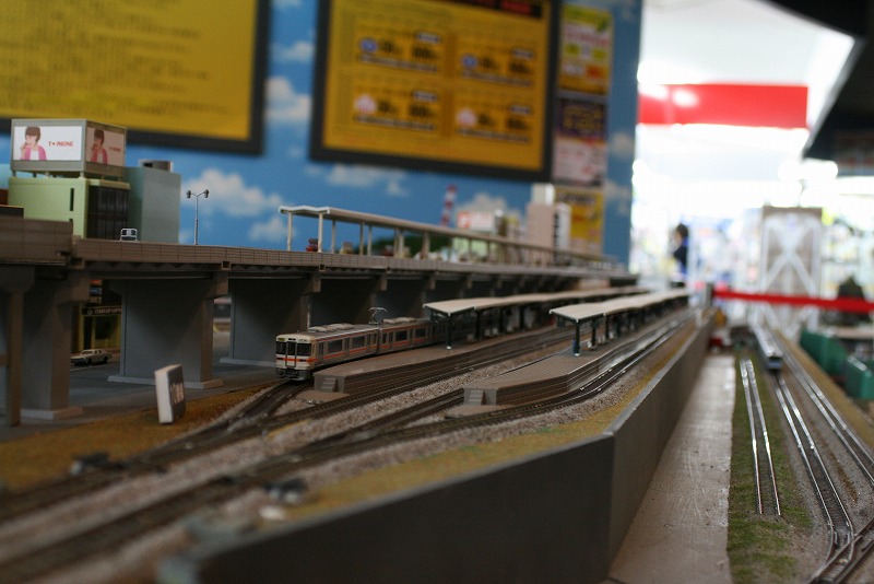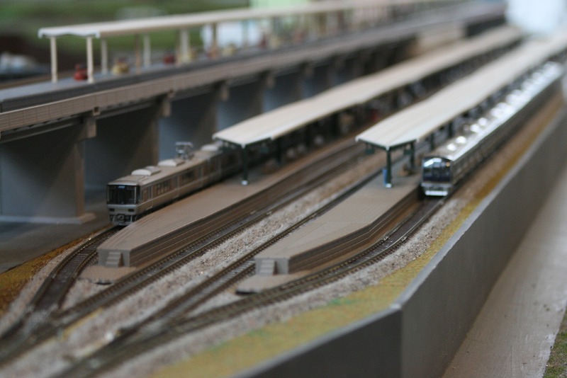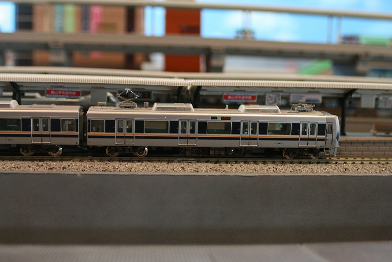 駅を発車していく321系。実車どおり、リアルなウェザリングが目を引きます。