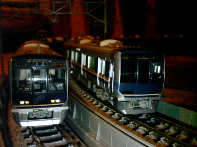 ここでつい最近出来たカントレール高架での321系の並びを貼っておきます。左がカトー、右がトミックスです。見せつけるようにしてカーブを通過していく姿は非常にかっこいいです。