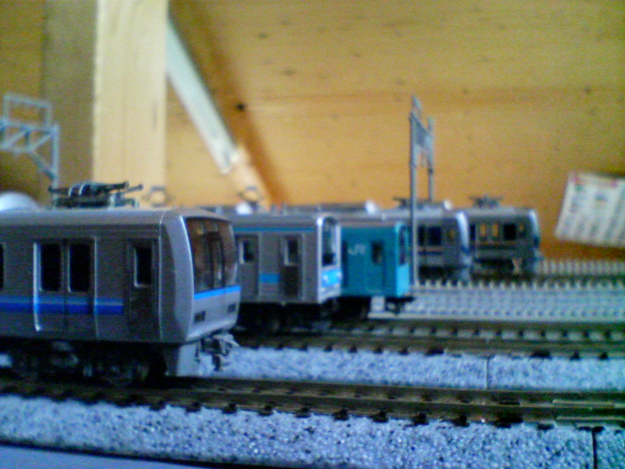 今日は電車区と本線を使って5編成を並べてみました。並べたのは手前から207系、205系、201系N30、321系トミックス、321系カト―です。関西の通勤車を持っている人ならどれか1つはあるのではないでしょうか?でもやっぱり201系の原型が欲しいですね・・・。あれが居ないと関西の通勤車は語れませんから。
