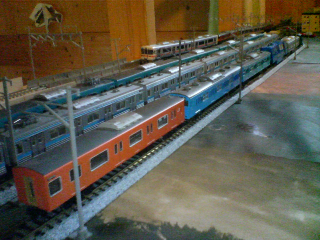 止まっている車両は手前からオレンジN40のクハ103-827、自分で塗り替えたクハ103青2両、カヤ6492、モハ320-20、ヨ8219です。