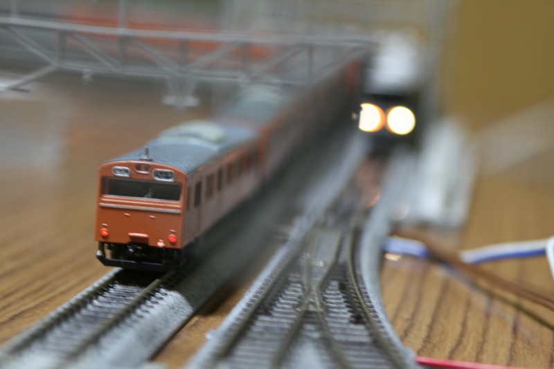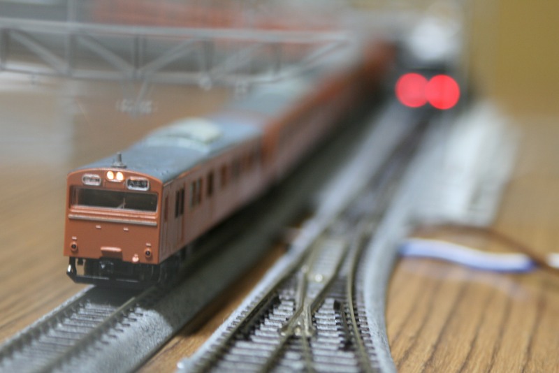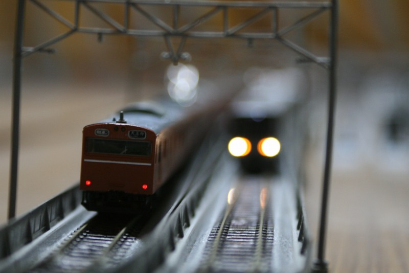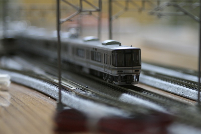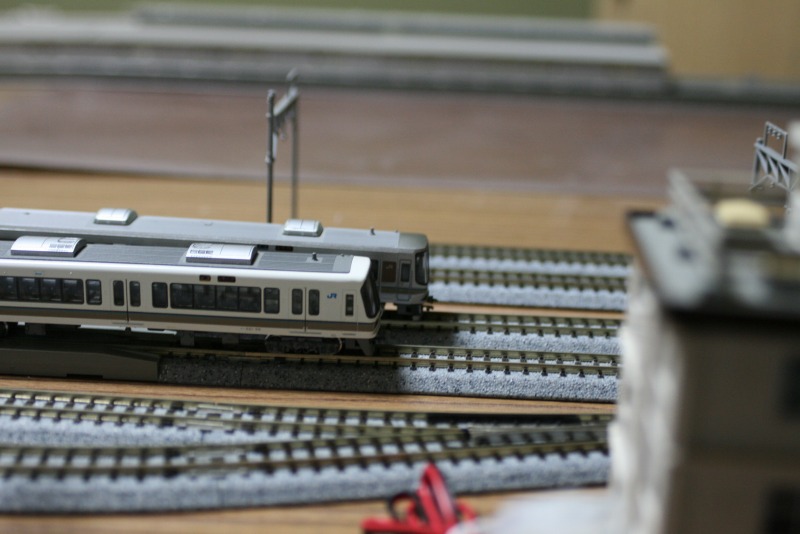 大阪環状線っぽい感じで一枚。カメラのボケを利用して223系2000番台を関空快速に見立てて並べています。ブレてますね…。低速シャッターだとどうしても…。