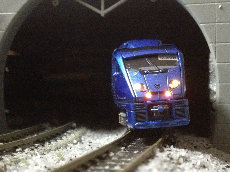 トンネルから顔を出す883系「ソニック」。ライトは白色から電球色にしてます。