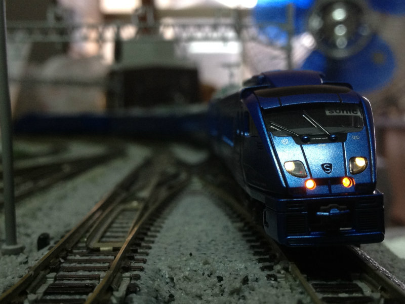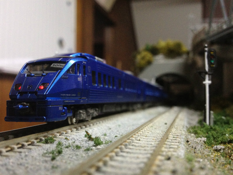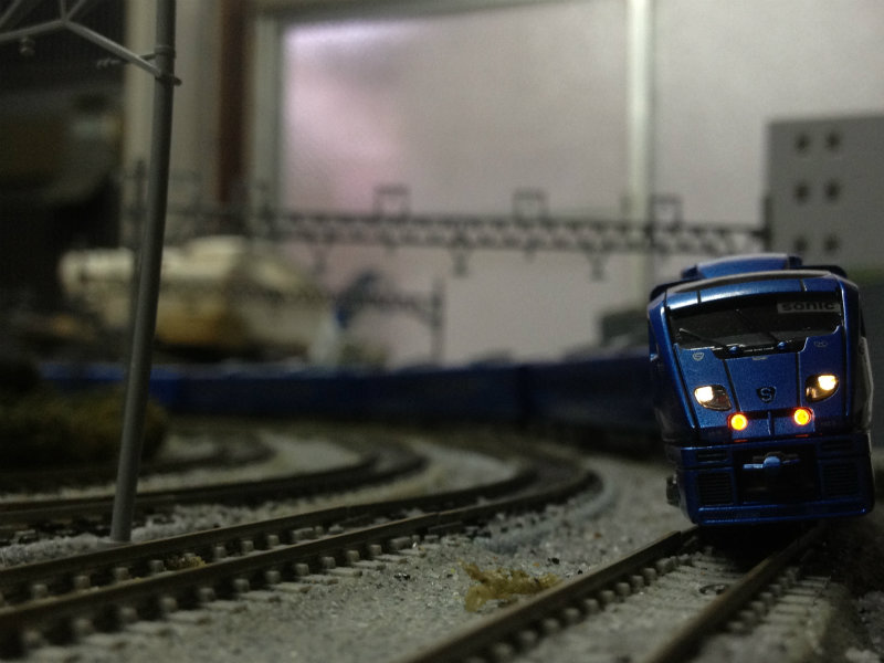 駅に入線する「ソニック」。深い青の車体が非常にきれいです。