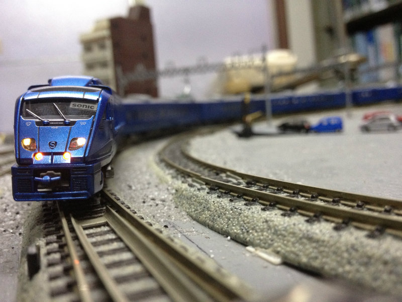 駅西側カーブを走る「ソニック」。本則+30km/hで駆け抜けます。