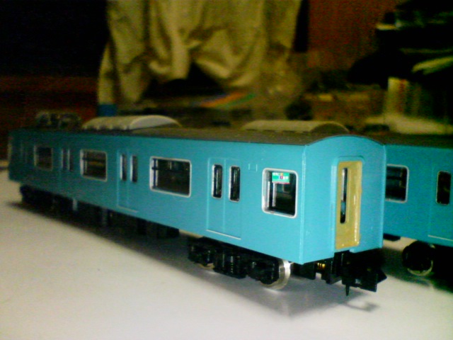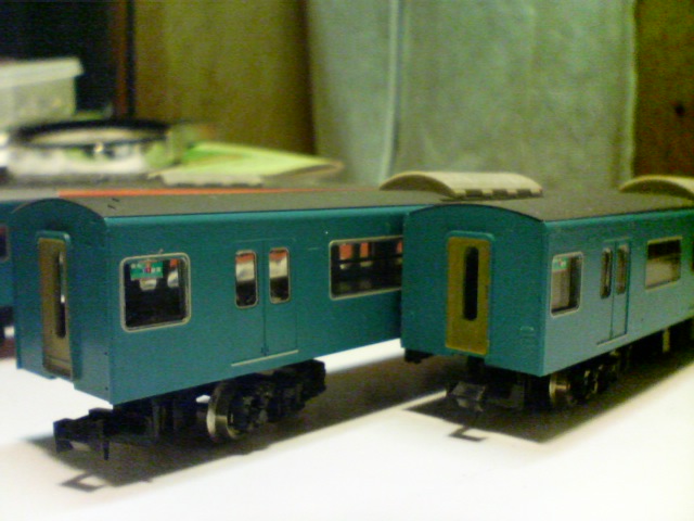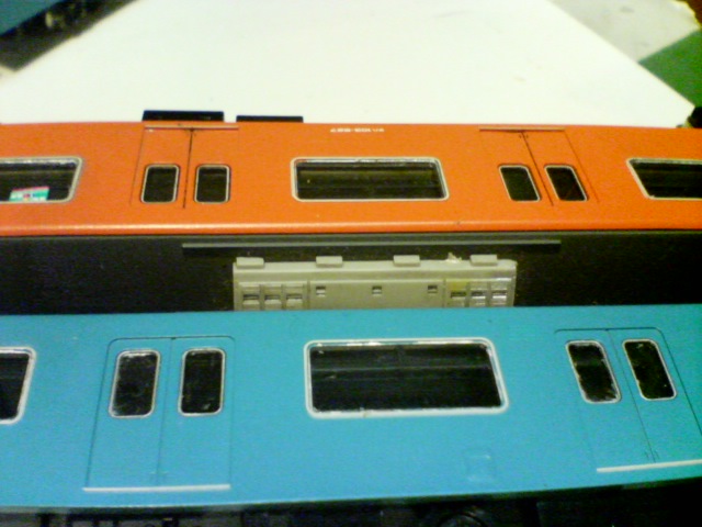 GM103/201系更新車キット製作ではほぼ当たり前の加工の色差しの窓フチ塗装も施行しました。この編成には追加でドア窓の金属押さえも実車どおり銀に塗りました。上は比較用の103系N40オレンジです。