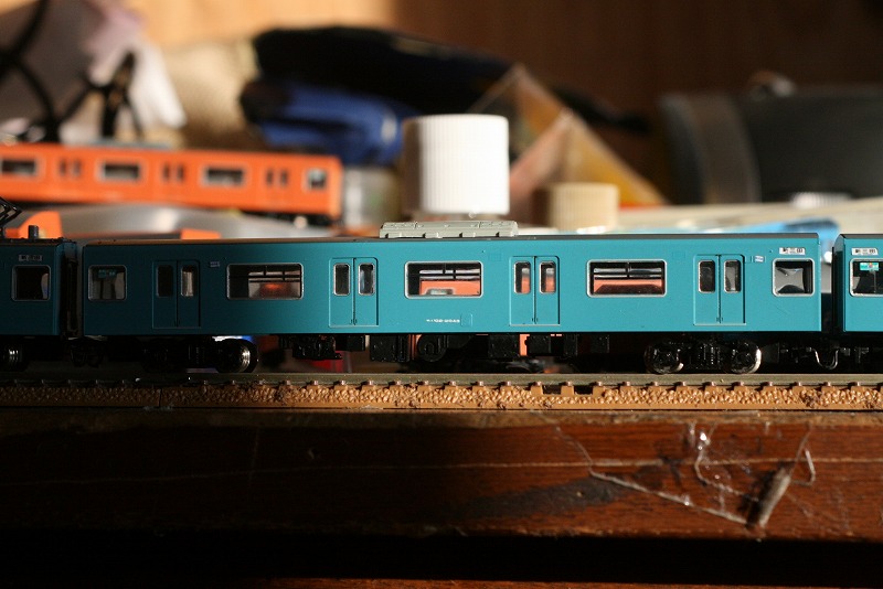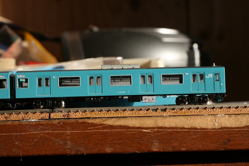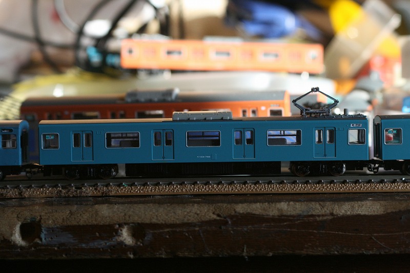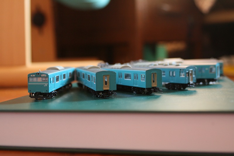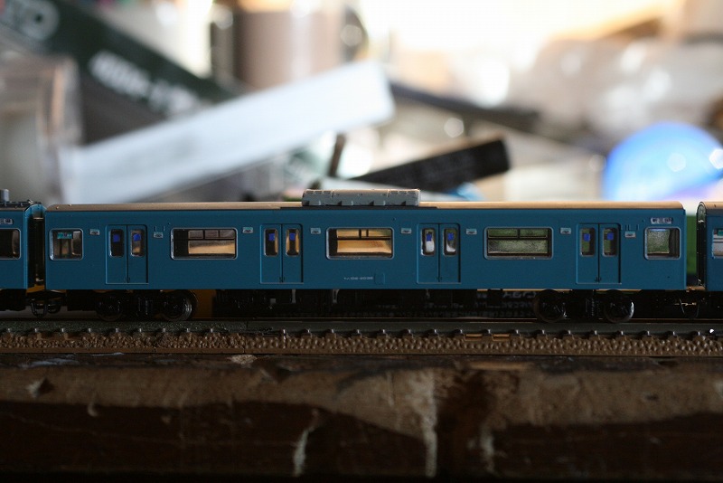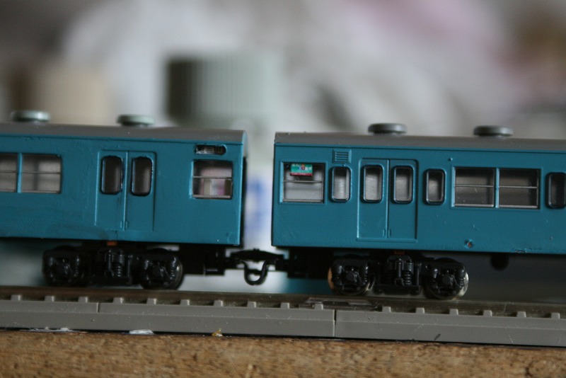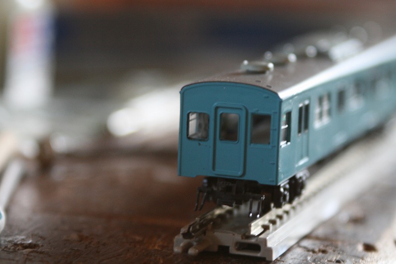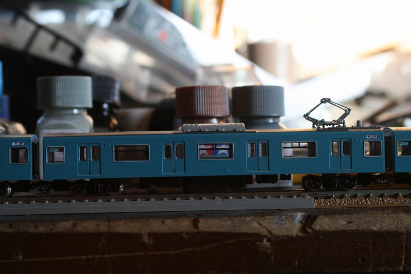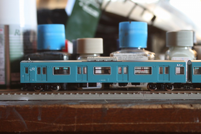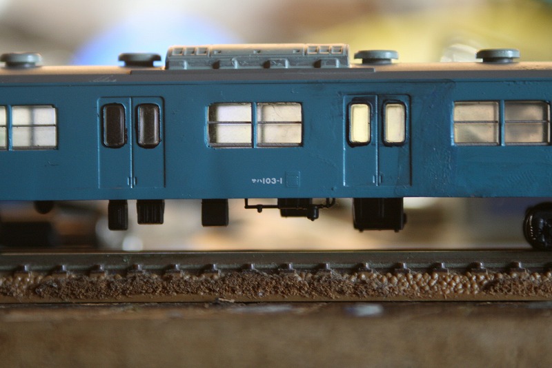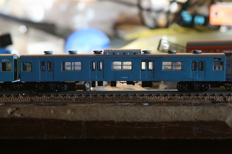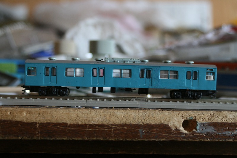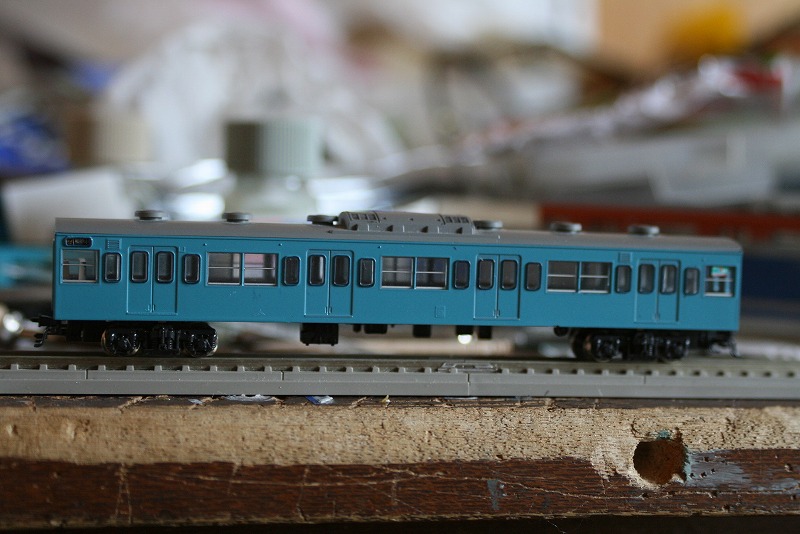 手持ちのオレンジのサハ(昨日回送されたやつです。)をスカイブルーに塗り替えて、モハ103から銀サッシのガラスをパクって各ステッカーを貼って作ったというお手軽作品です。