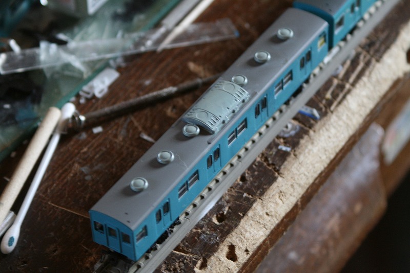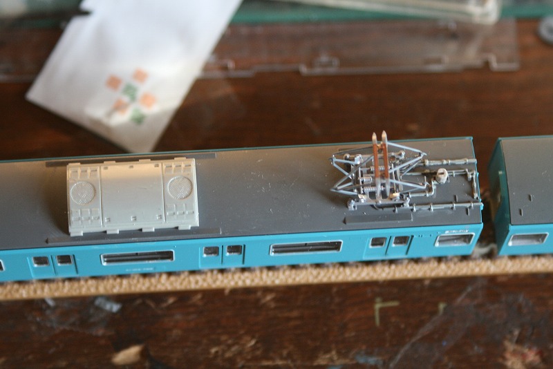 クーラーとパンタグラフ、屋根配管を塗装。といっても、クーラーは塗った感じがしませんねぇ。