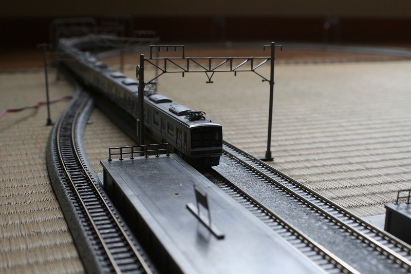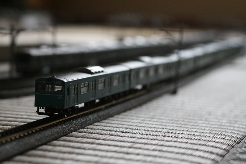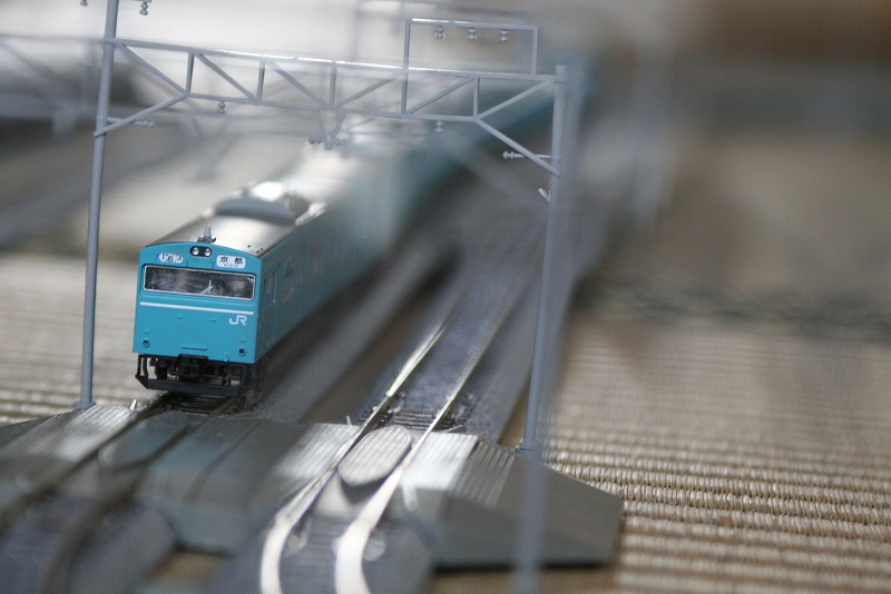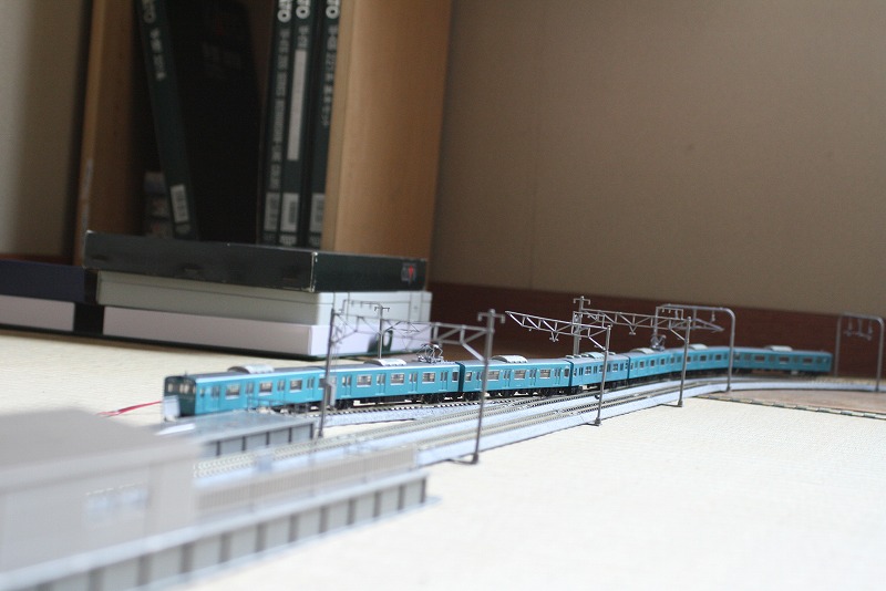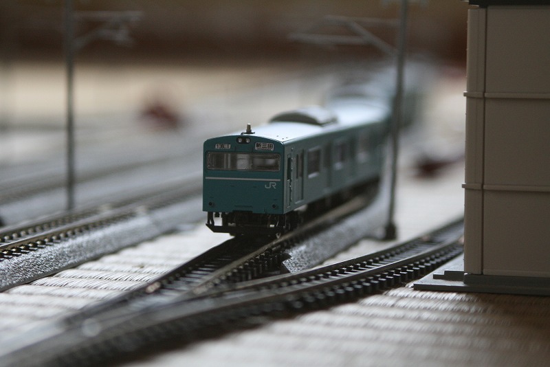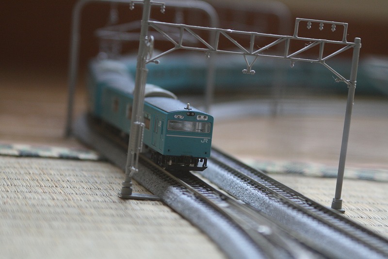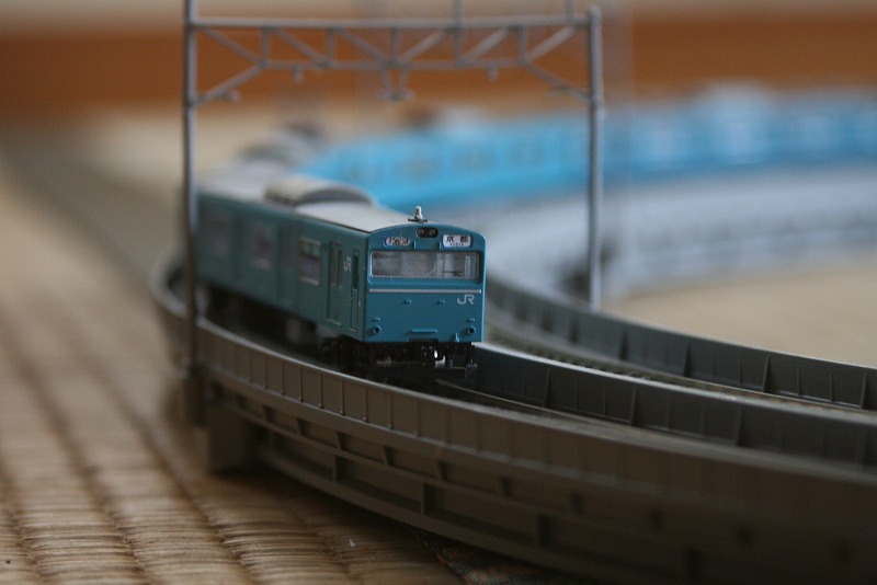 踏切付近で。直線区間で飛ばします!103系の爆音が唸る!(実際GMのモーターですし結構音立てますよ。)