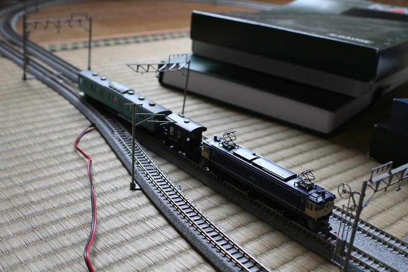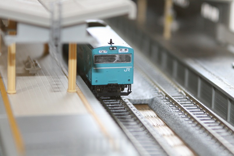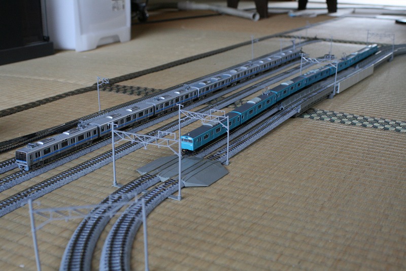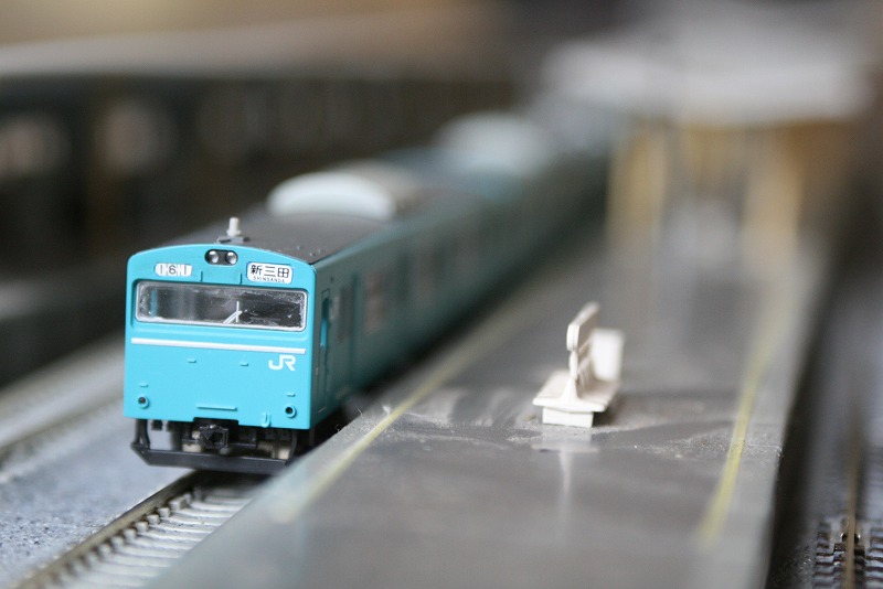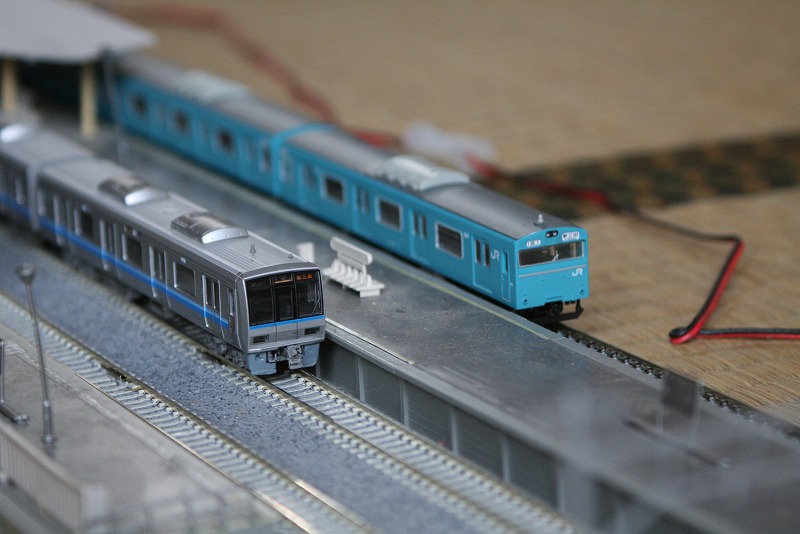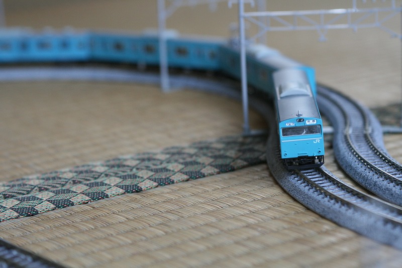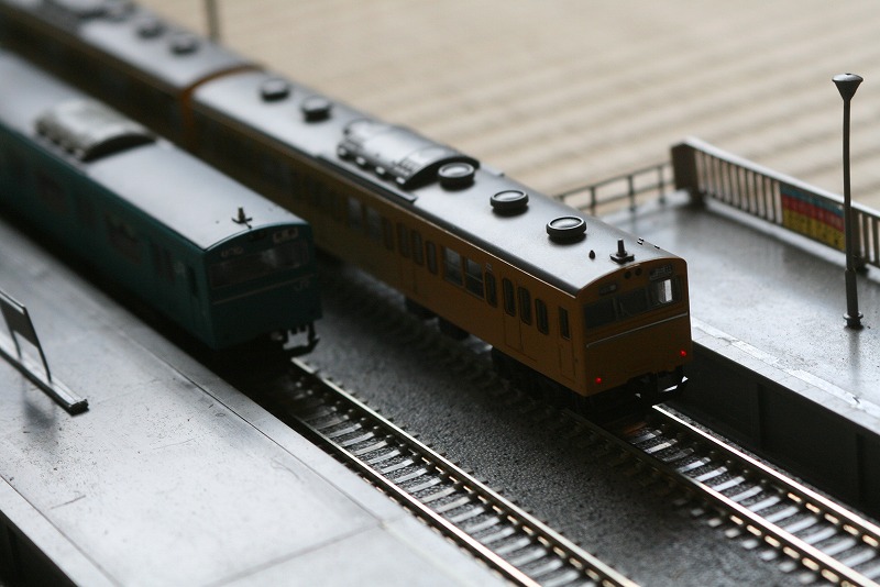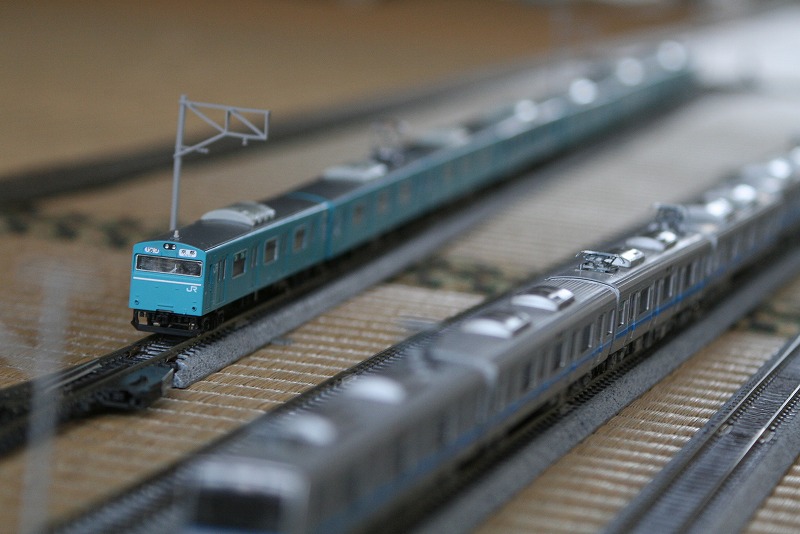 踏切付近で。直線区間で飛ばします!103系の爆音が唸る!(実際GMのモーターですし結構音立てますよ。)