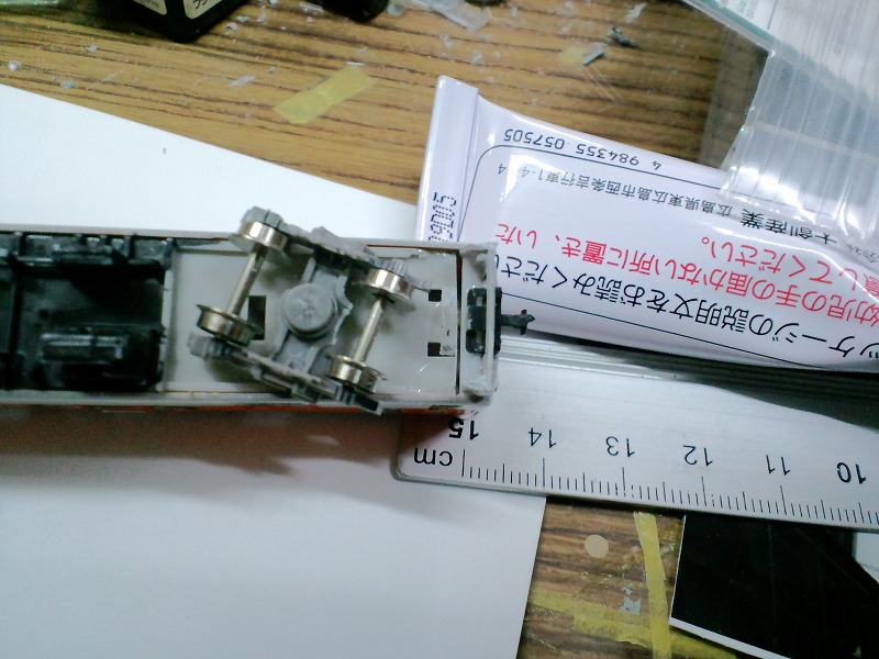 正解はスカートの移設です。車体側に1mm角のプラ棒2本を渡してスカートを車体側に設置しました。