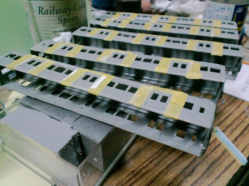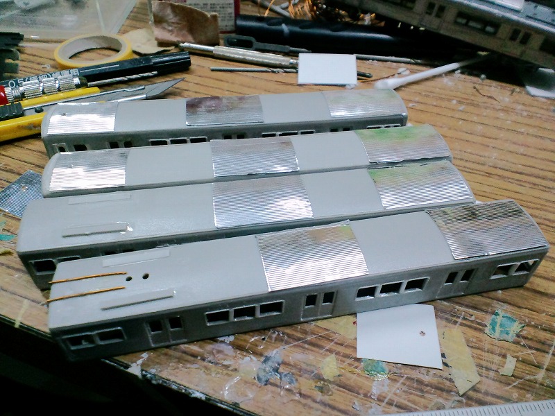 屋根をマスキングして車体塗装。銀ピカになりました。