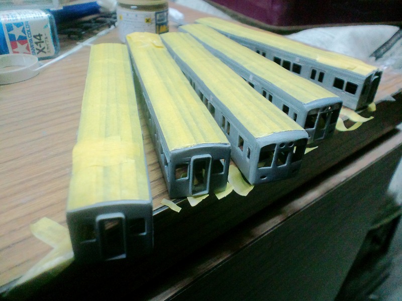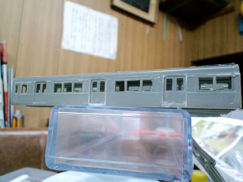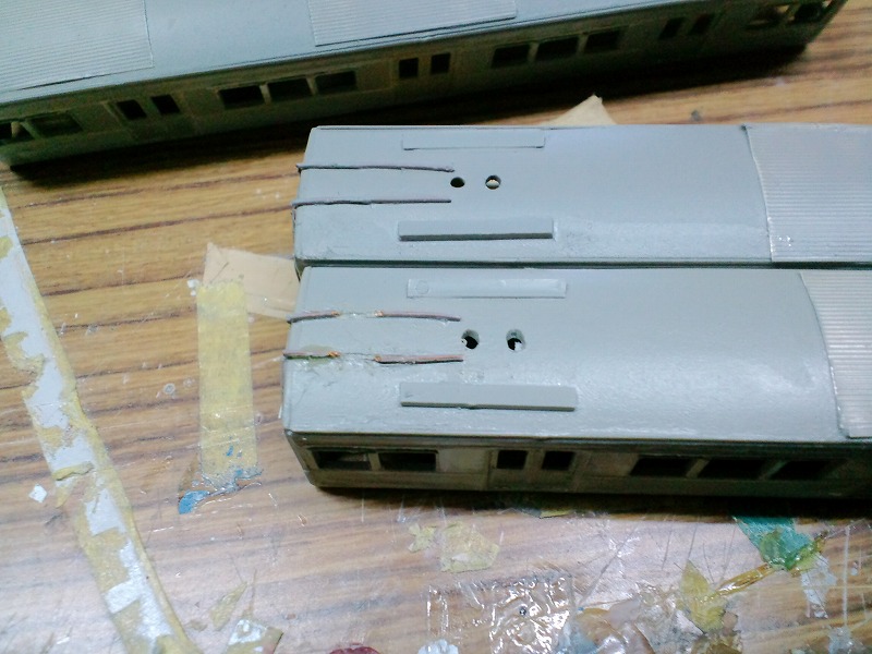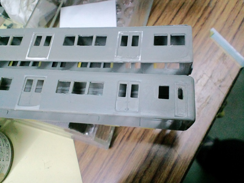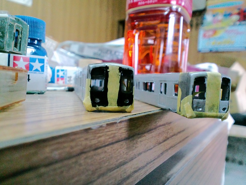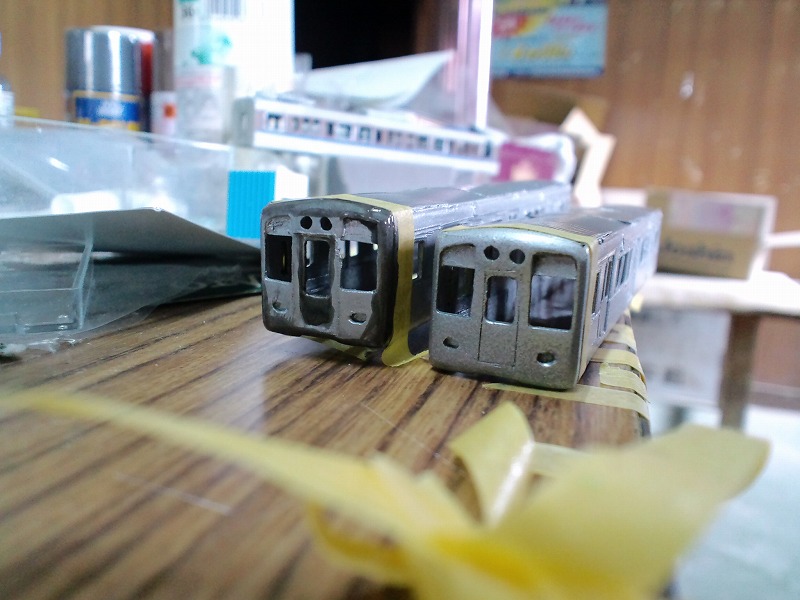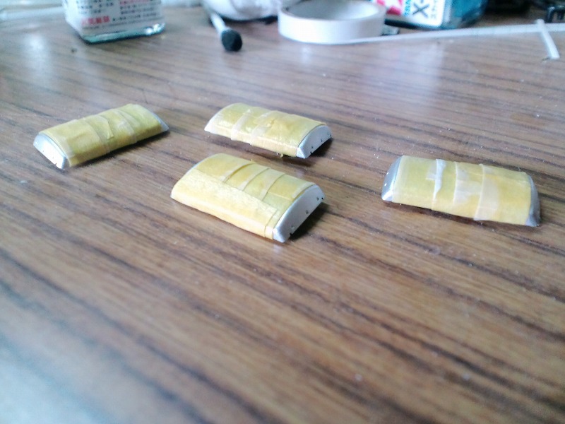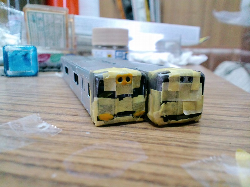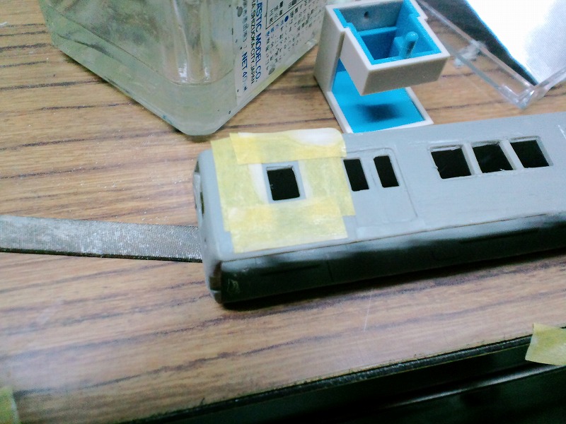 続いてはプレスライン(でいいのかな?)を再現するため窓の上下をマスキングしてまたパテ盛りします。