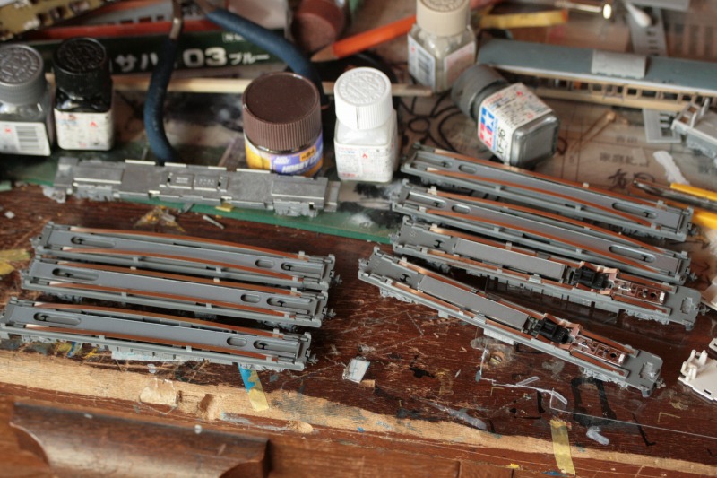 MA03編成は4両だったので筆塗りで何とか済ませられましたが8両ともなるとつらいので床塗装をスプレーで行いました。