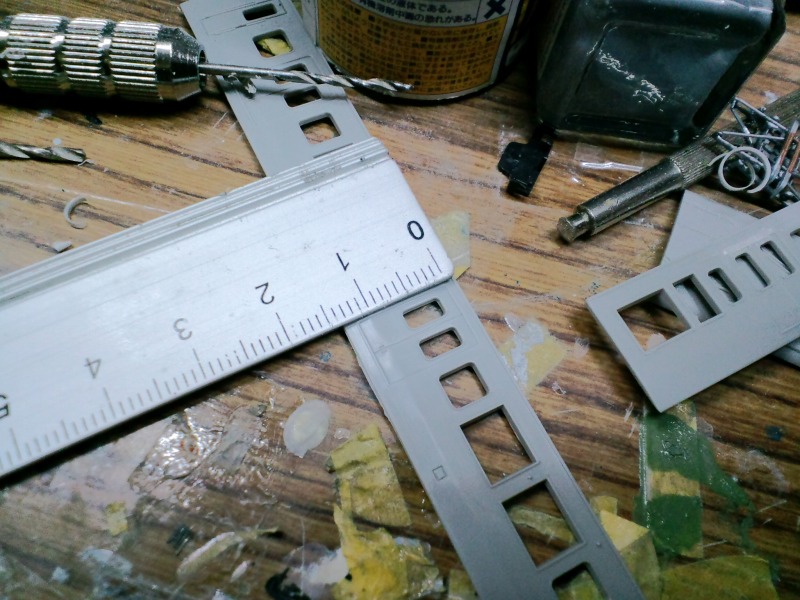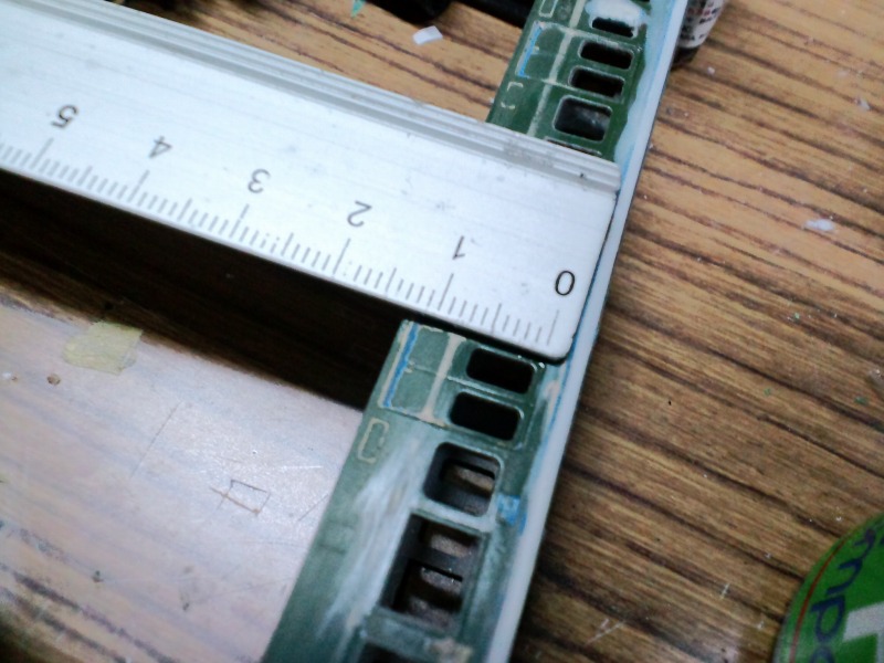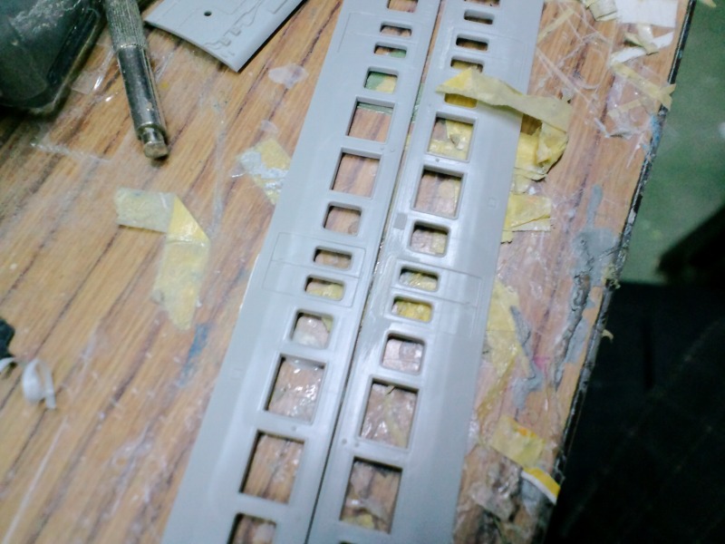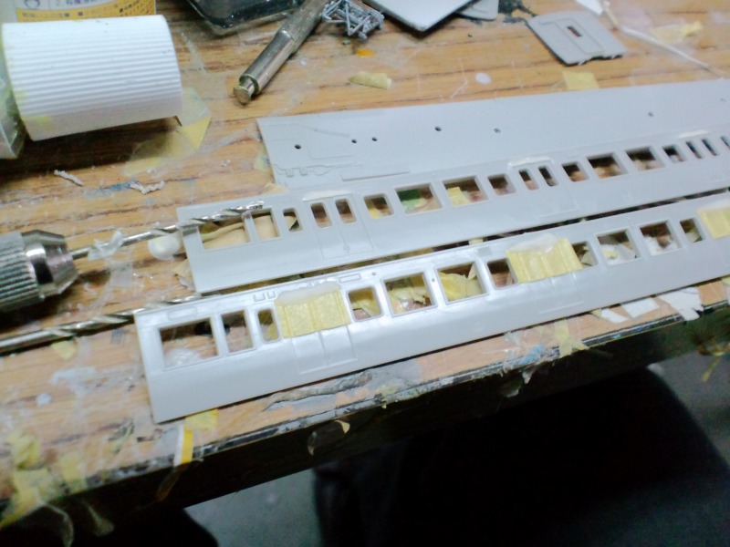 単純にドア窓の拡大をすれば別にいいんですが、12枚×4=48枚分のドアを加工するのは面倒くさいし、なにしろ均一には出来ないですしHゴムも削り落とすので復元が難しいですし(阪神9000系の工法ではちょっと無理があります)・・・悩んだ末にこうしました。
