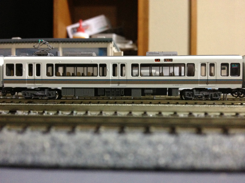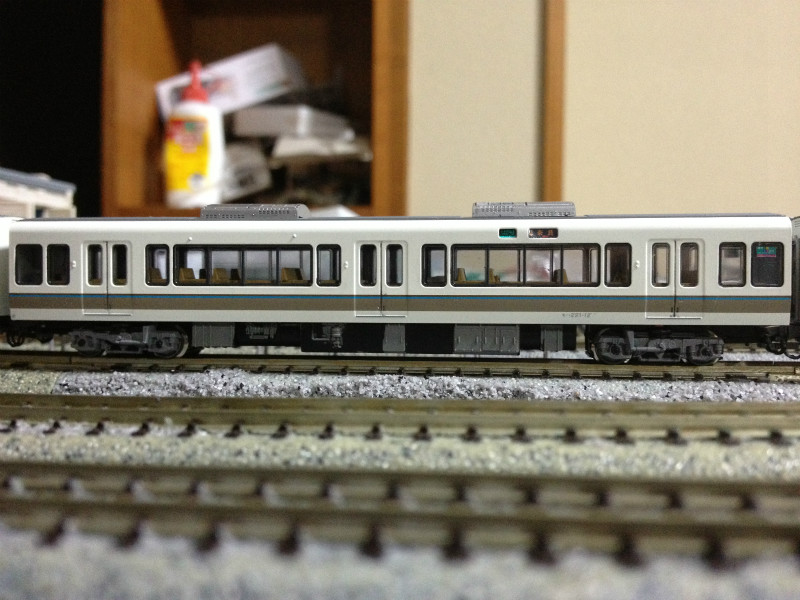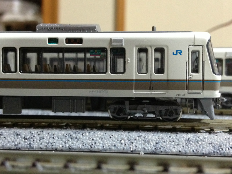 NA401編成の前面。実車に則りクモハ221-12の一部のガラスを緑色にしてます。