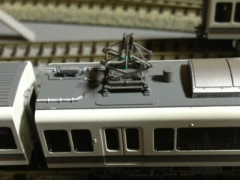 パンタ周り。奈良区特有のパンタのホーンの着色を行っています。