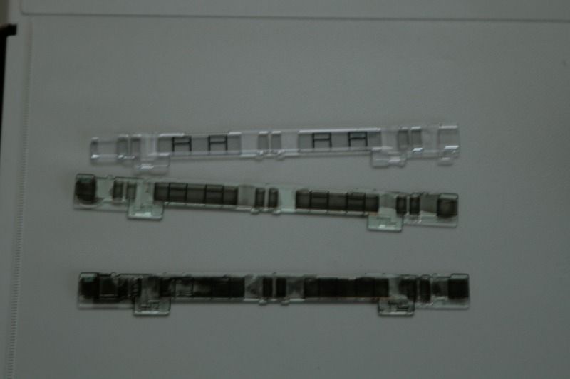 上から1次車デフォルトのガラス、2次車のガラスにクリヤーブラック(自作品)を塗ったもの、それに加えスモークを上塗りしたものです。