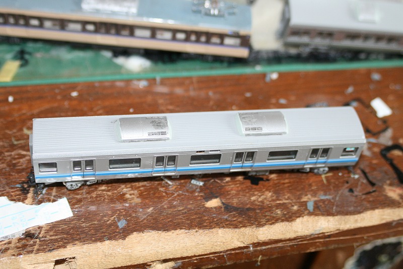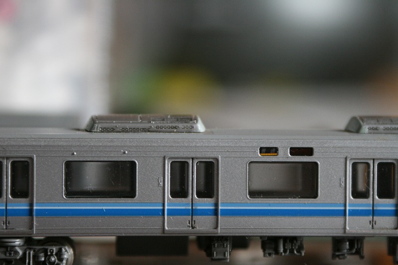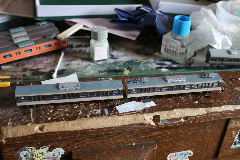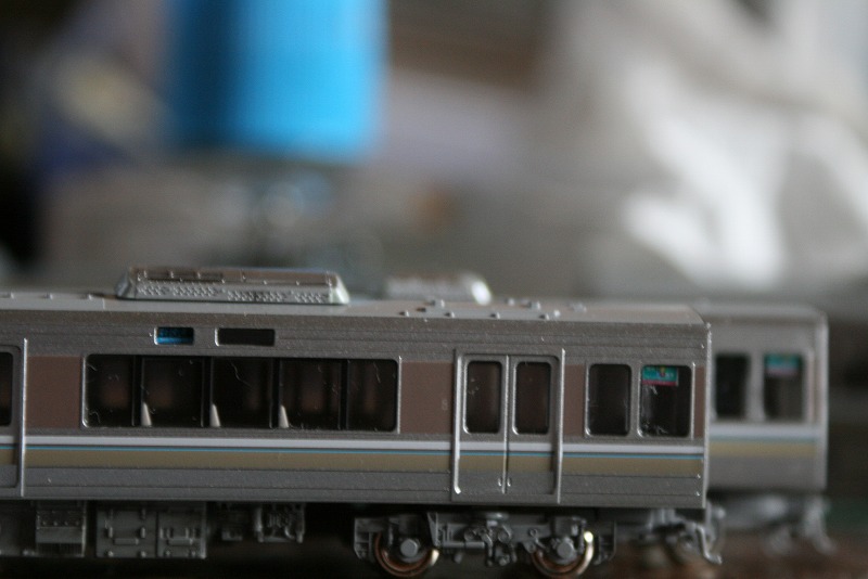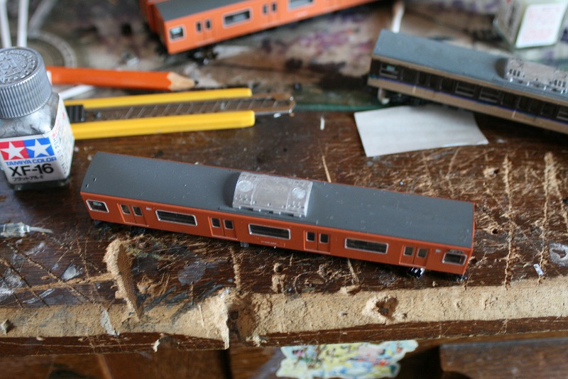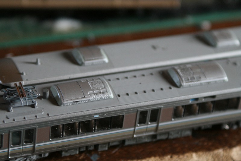モリ10編成ですが、一部の車両(2両目と4両目)のクーラーが201系タイプのAU75Gという銀色クーラーなんでそれを再現。ただ銀色に塗っただけで実際には側面に筋が入っているので(201/205系のクーラーを参照)タイプということで…。
