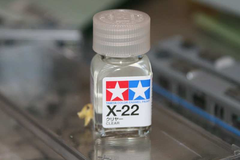 タミヤ X‐22 クリヤー(ツヤあり)です。あと筆も要ります。筆代を合わせても300円しないと思います。