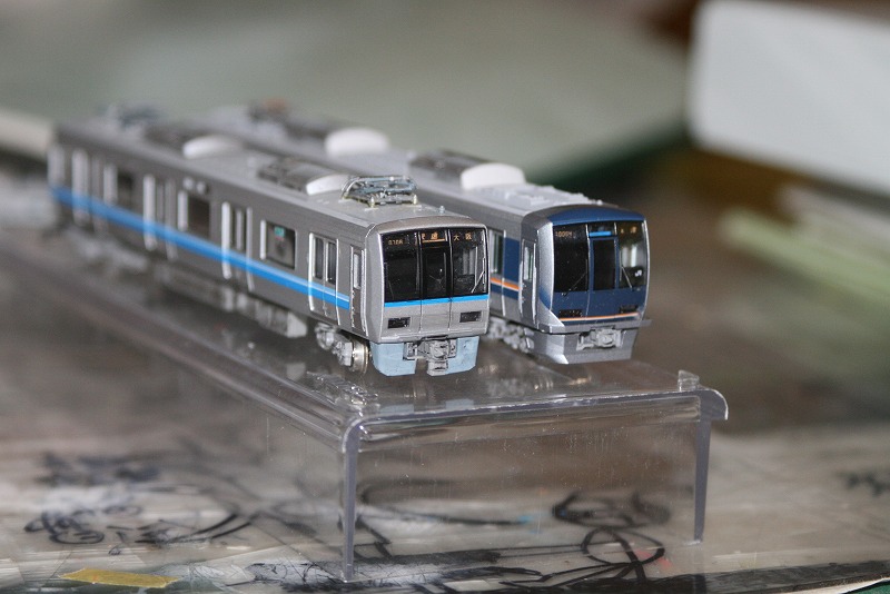 カトー321系と並べてみます。手前がトミックスです。前面の青色の濃さは違いますが鏡面表現がついたので多少はマシになりました。