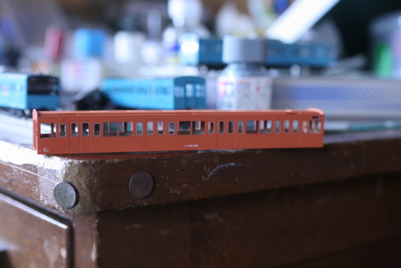 モハ102-237の現在の様子。分解が終わったので窓枠を削って、窓の四隅に瞬間接着剤をつけて作ったサハ103-1の技術を生かしユニット窓車から初期車を作ります。