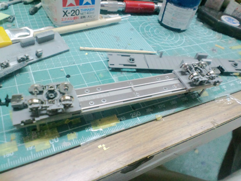 今回207-1000系用の床下機器をKATO223-2000系とそっくり取り替えるのでまず切るために線を引いてみます。