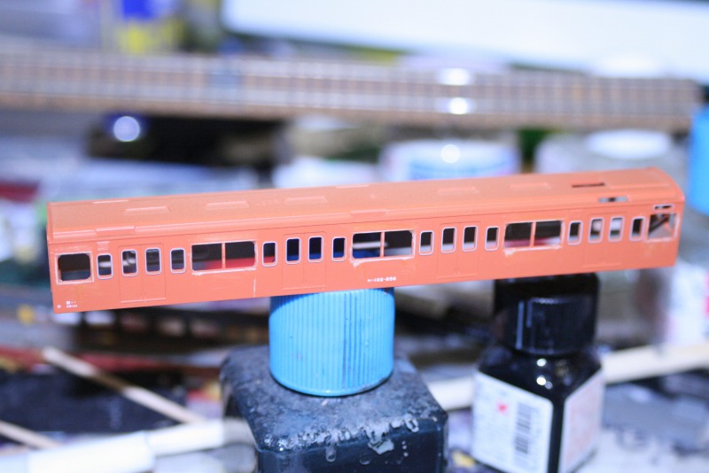 このようにユニットサッシの窓枠を削り落とし、角に瞬間接着剤を少しつけて初期車特有の角にRが付いた窓を表現します。