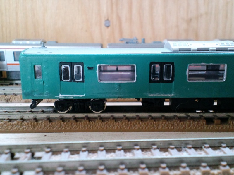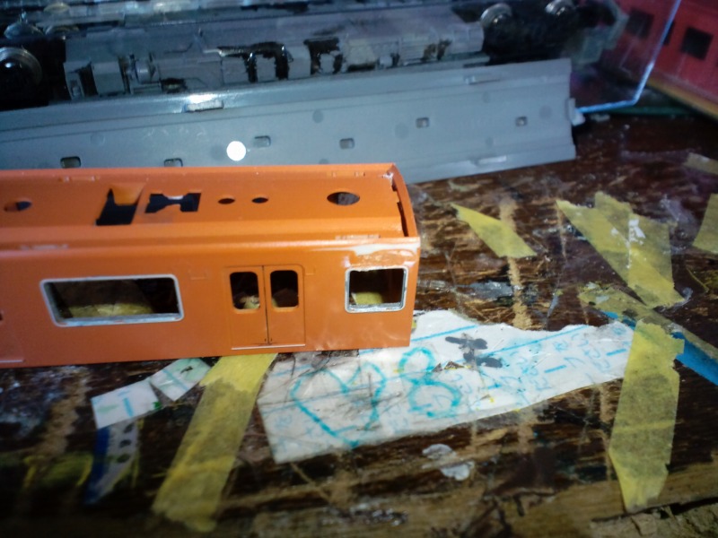 前面窓を拡大し、段差(105系のブラックフェイス部分)を瞬間接着剤で埋めます。
